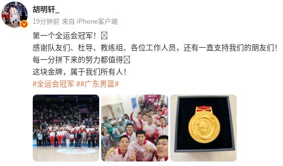 6686体育11月13日讯 全运男篮总决赛,广东队击败浙江队,获得冠军,赛后,胡明轩在社媒发文分享自己的感想。