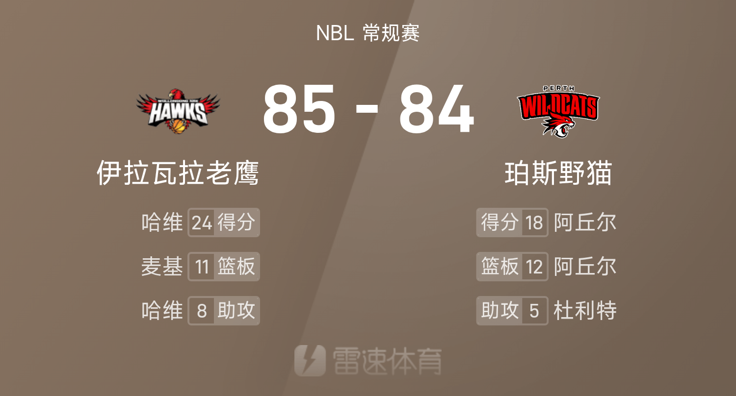6686体育10月25日讯 25/26赛季NBL 常规赛,珀斯野猫对阵伊拉瓦拉老鹰。双方全场战罢,珀斯野猫84-85不敌伊拉瓦拉老鹰。哈维砍下全场最高的24分5板8助,率领伊拉瓦拉老鹰胜利取胜。