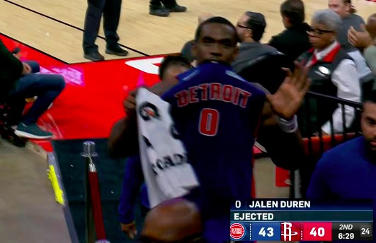 杜伦挥肘打到阿门·汤普森面部,被吹罚二级恶意违例遭驱逐