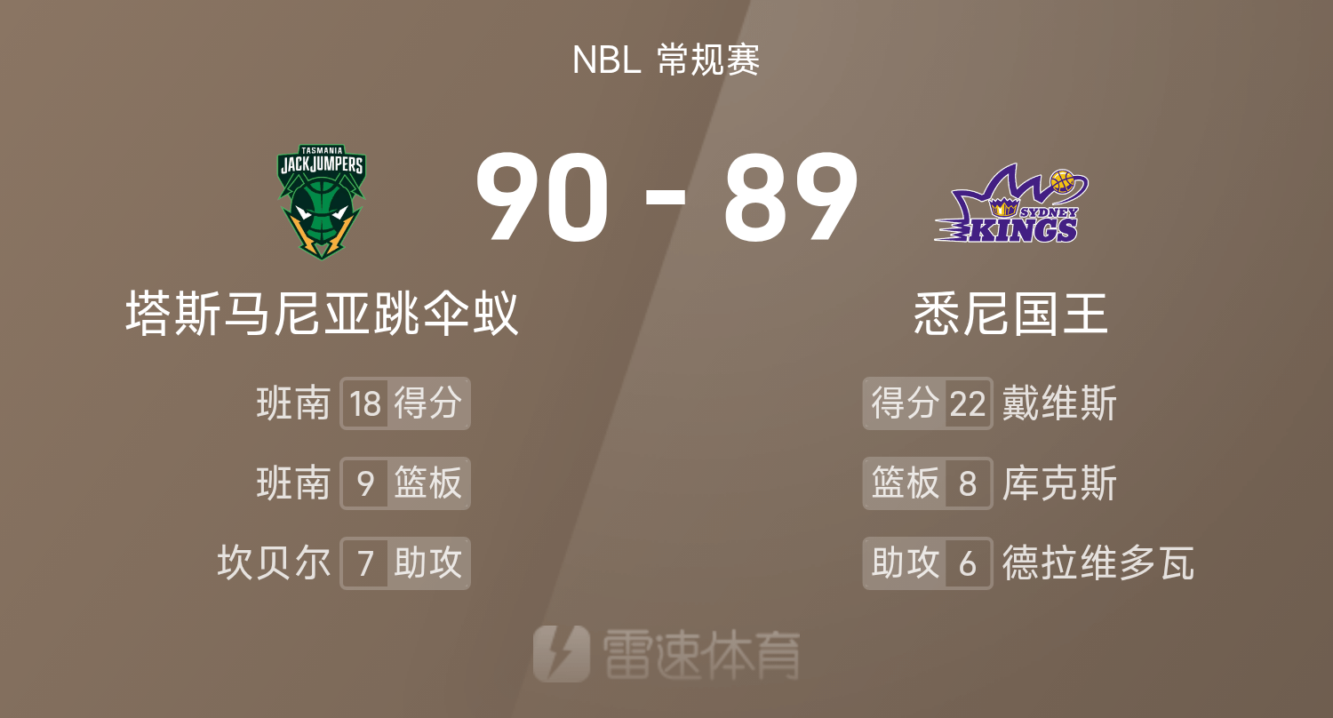 6686体育10月26日讯 25/26赛季NBL 常规赛,悉尼国王对阵塔斯马尼亚跳伞蚁。双方全场战罢,悉尼国王89-90不敌塔斯马尼亚跳伞蚁。班南得到18分9板2助率队取胜,戴维斯空砍全场最高的22分6板5助。