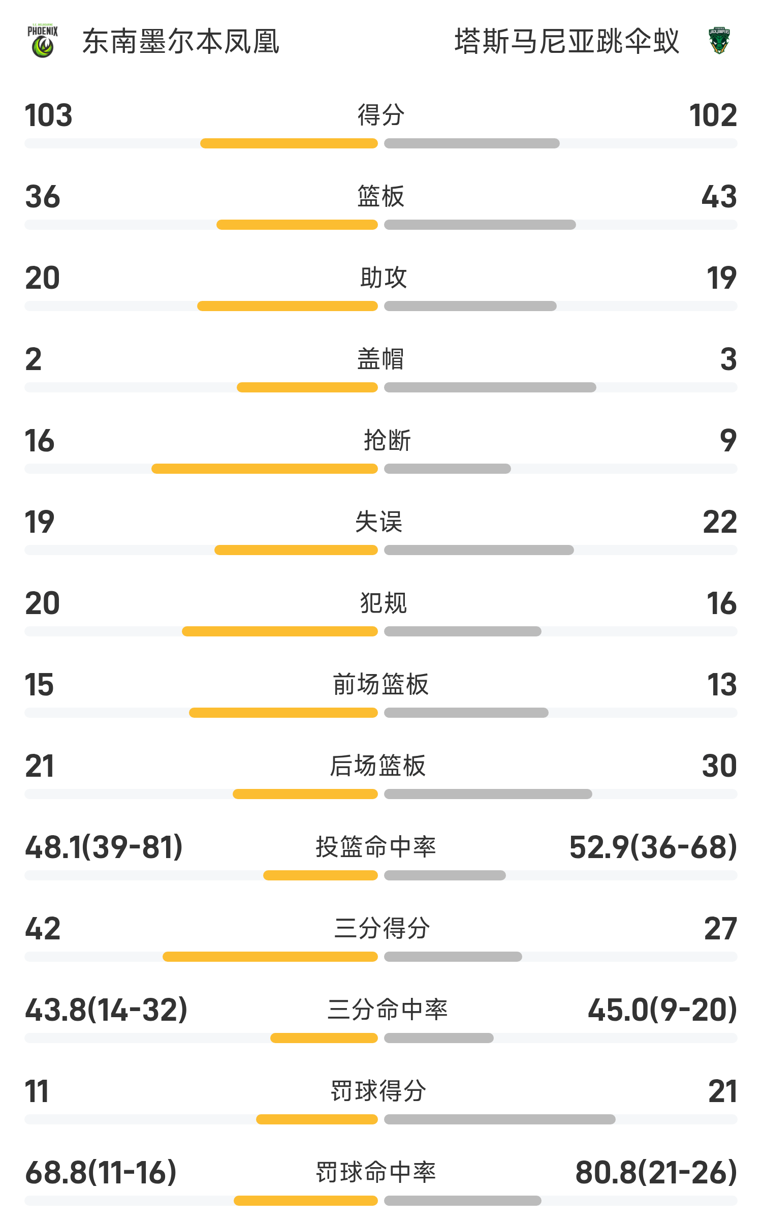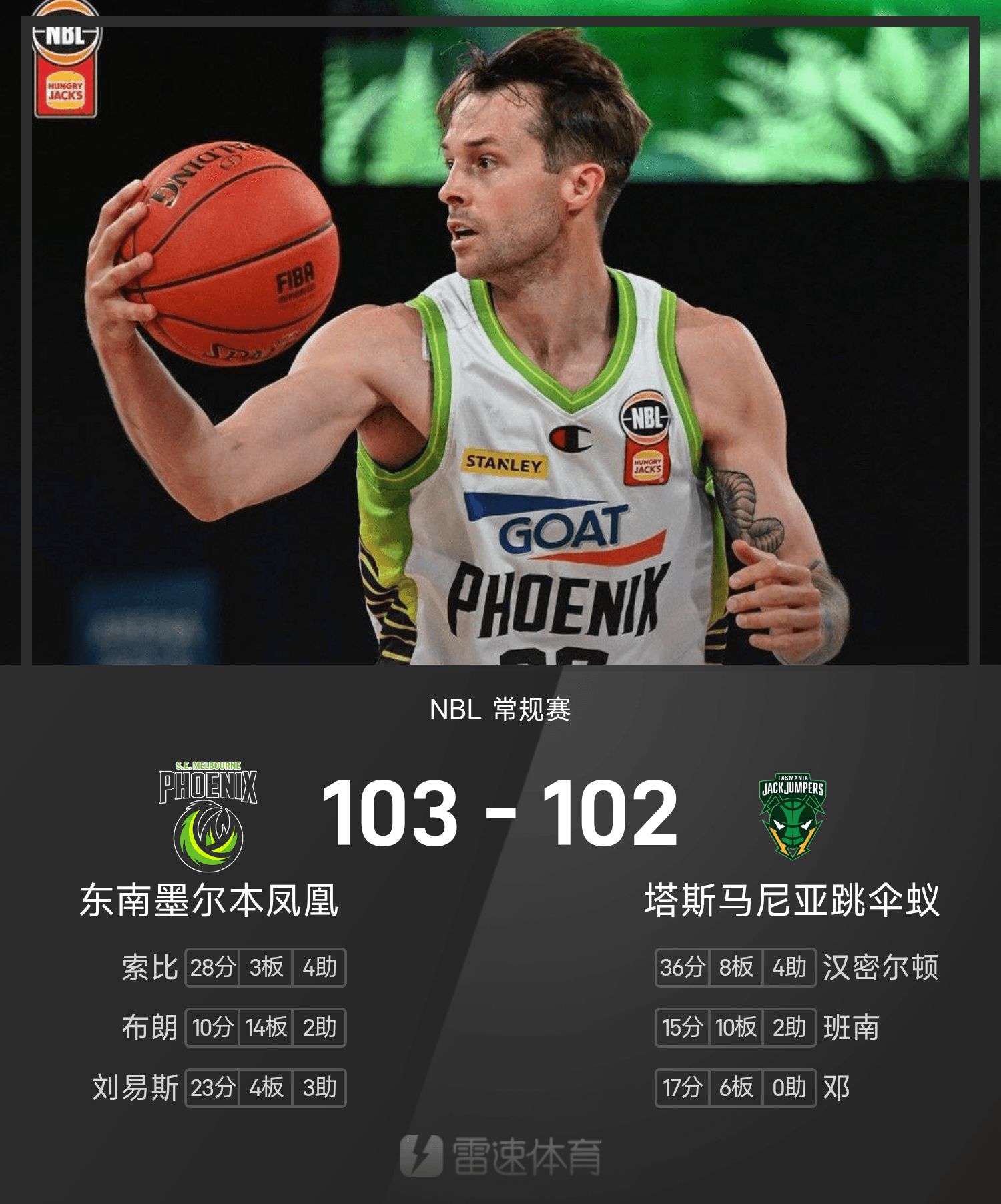 NBL战报:索比28分,东南墨尔本凤凰103-102险胜塔斯马尼亚跳伞蚁