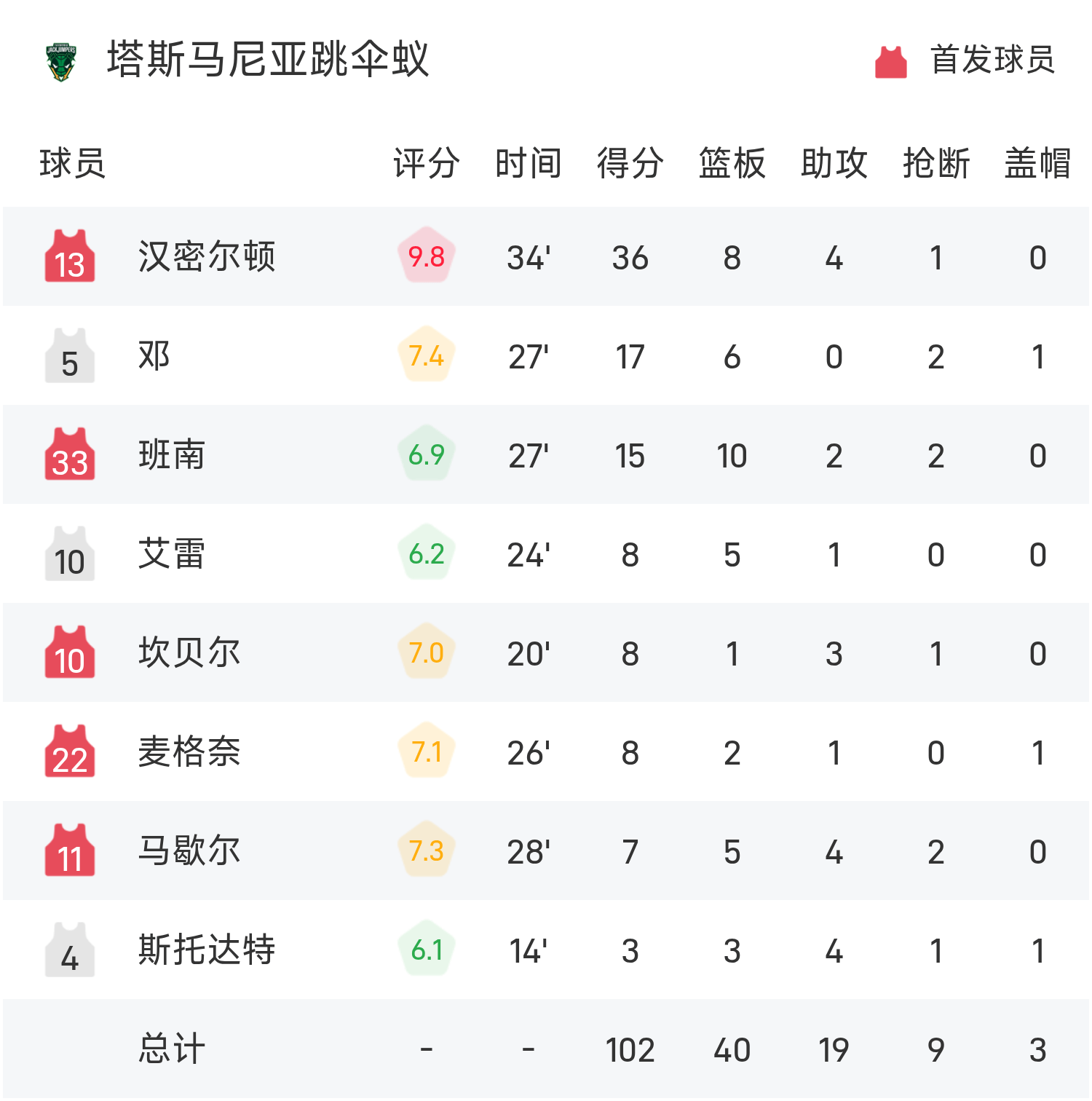 6686体育11月06日讯 25/26赛季NBL 常规赛,塔斯马尼亚跳伞蚁对阵东南墨尔本凤凰。双方全场战罢,塔斯马尼亚跳伞蚁102-103不敌东南墨尔本凤凰。索比得到28分3板4助率队取胜,汉密尔顿空砍全场最高的36分8板4助。