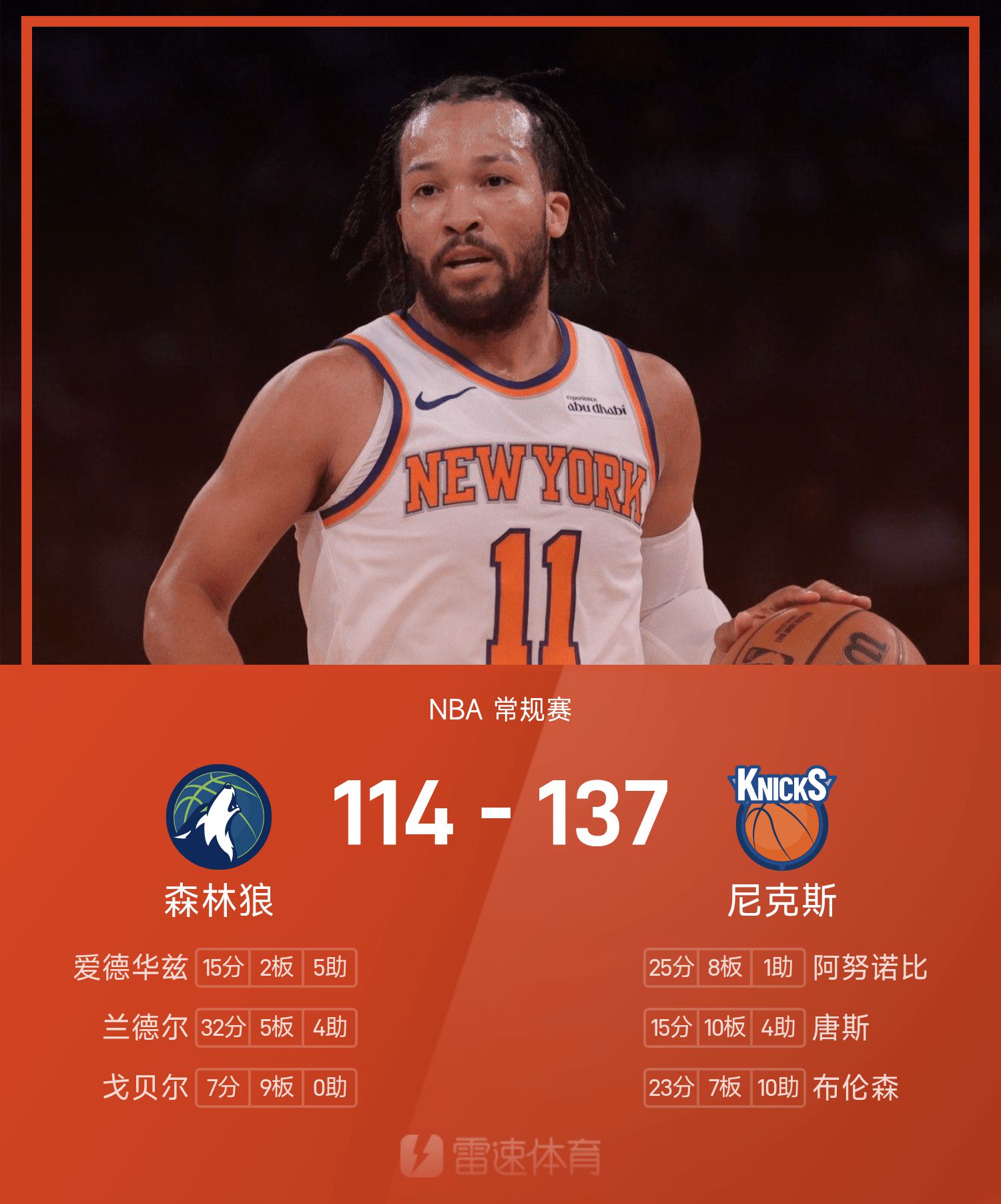 NBA战报:大头23+7+10,尼克斯137-114大胜森林狼