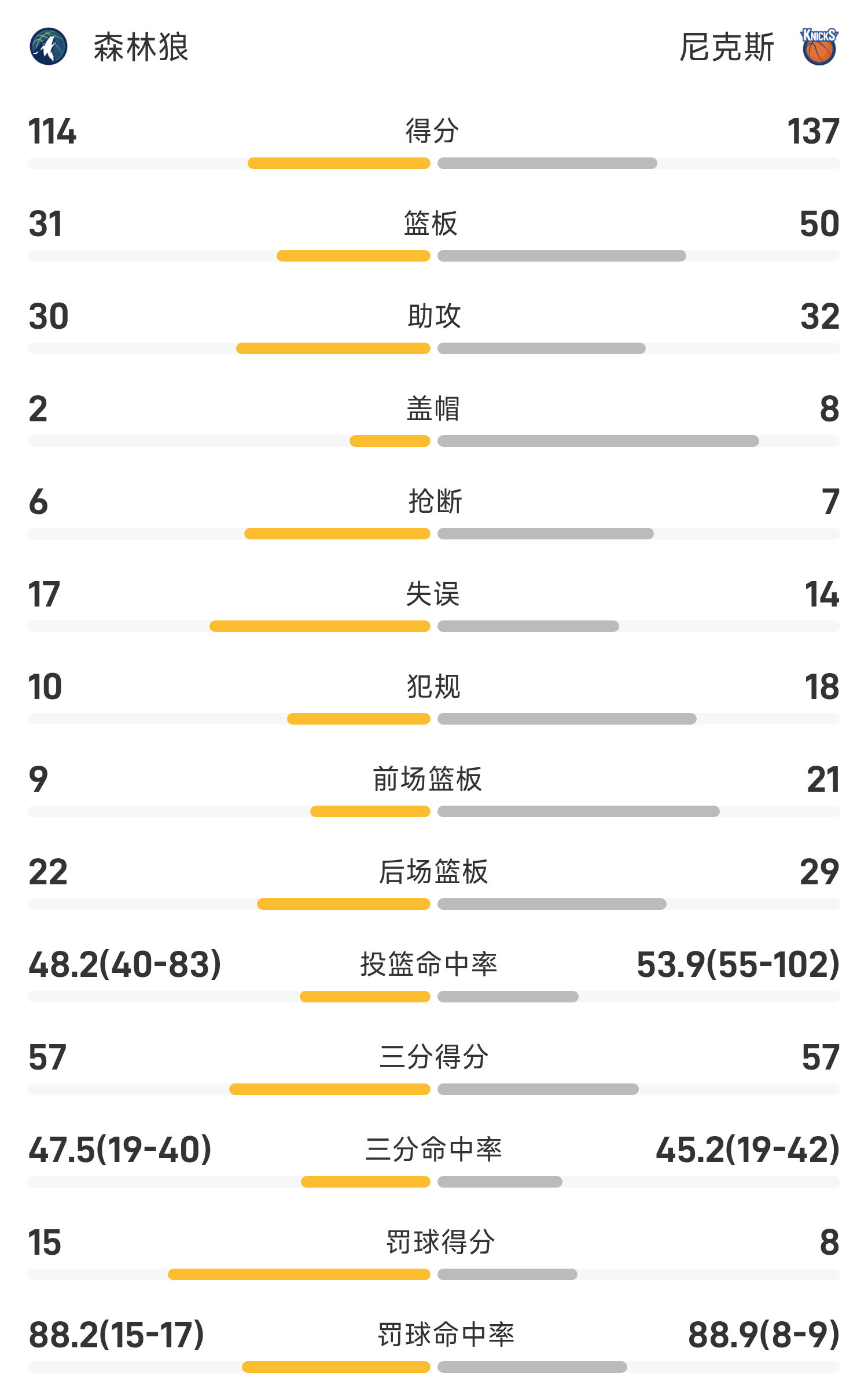 双方全场战罢,尼克斯137-114战胜森林狼。