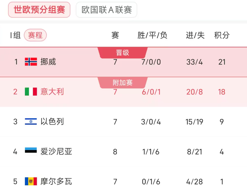 I组目前挪威21分排名第一,意大利18分排名第二,以色列(9分)、爱沙尼亚(4)、摩尔多瓦(1)都已失去竞争前两名的期望。