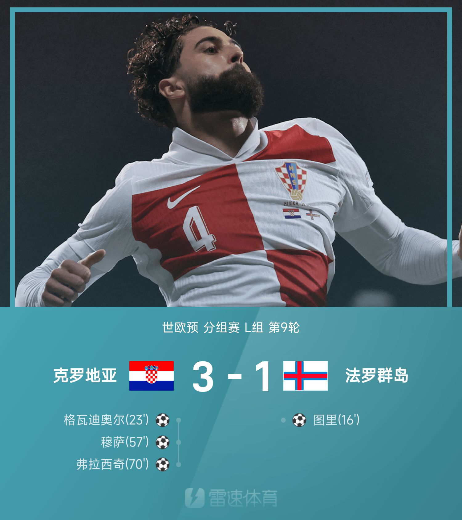 6686体育11月15日讯 26赛季世欧预分组赛L组第9轮,克罗地亚3-1战胜法罗群岛。全场竞赛,图里折射破门协助法罗群岛客队场领跑位,随后格瓦迪奥尔、穆萨、弗拉西奇连续破门完成逆转,莫德里奇第61分钟被换下,克罗地亚提前晋级世杯赛。