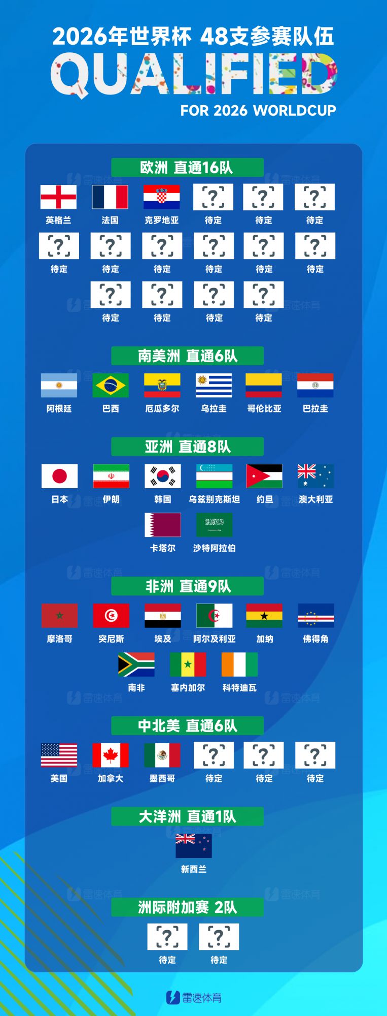 亚洲8席:日本、伊朗、韩国、乌兹别克斯坦、约旦、澳大利亚、卡塔尔、沙特阿拉伯