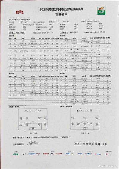 6686体育10月26日讯 博主“牛眼看球”透露,山东泰山临时变更的与海港一役的首发,其中路易斯·洛佩斯下场,彭啸变为首发。