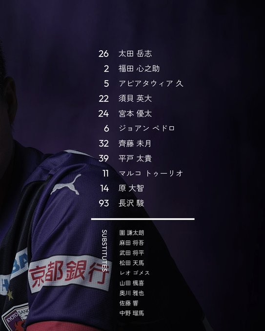 京都不死鸟首发阵容:26-太田岳志、2-福田心之助、5-塔维亚、22-须贝英大、22-宫本优太、6-佩德罗、32-斋藤未月、39-平户太贵、11-图里奥、14-原大智、93-长泽骏