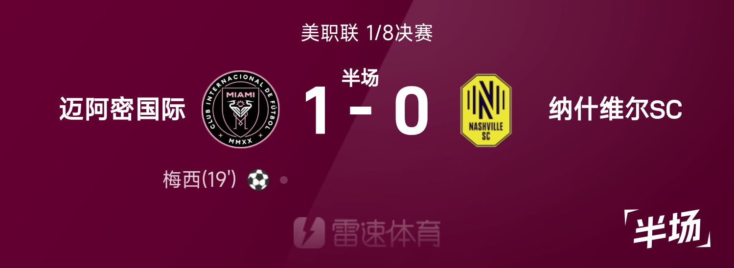 美职半场:苏牙助攻梅西头槌破门,迈阿密暂1-0纳什维尔