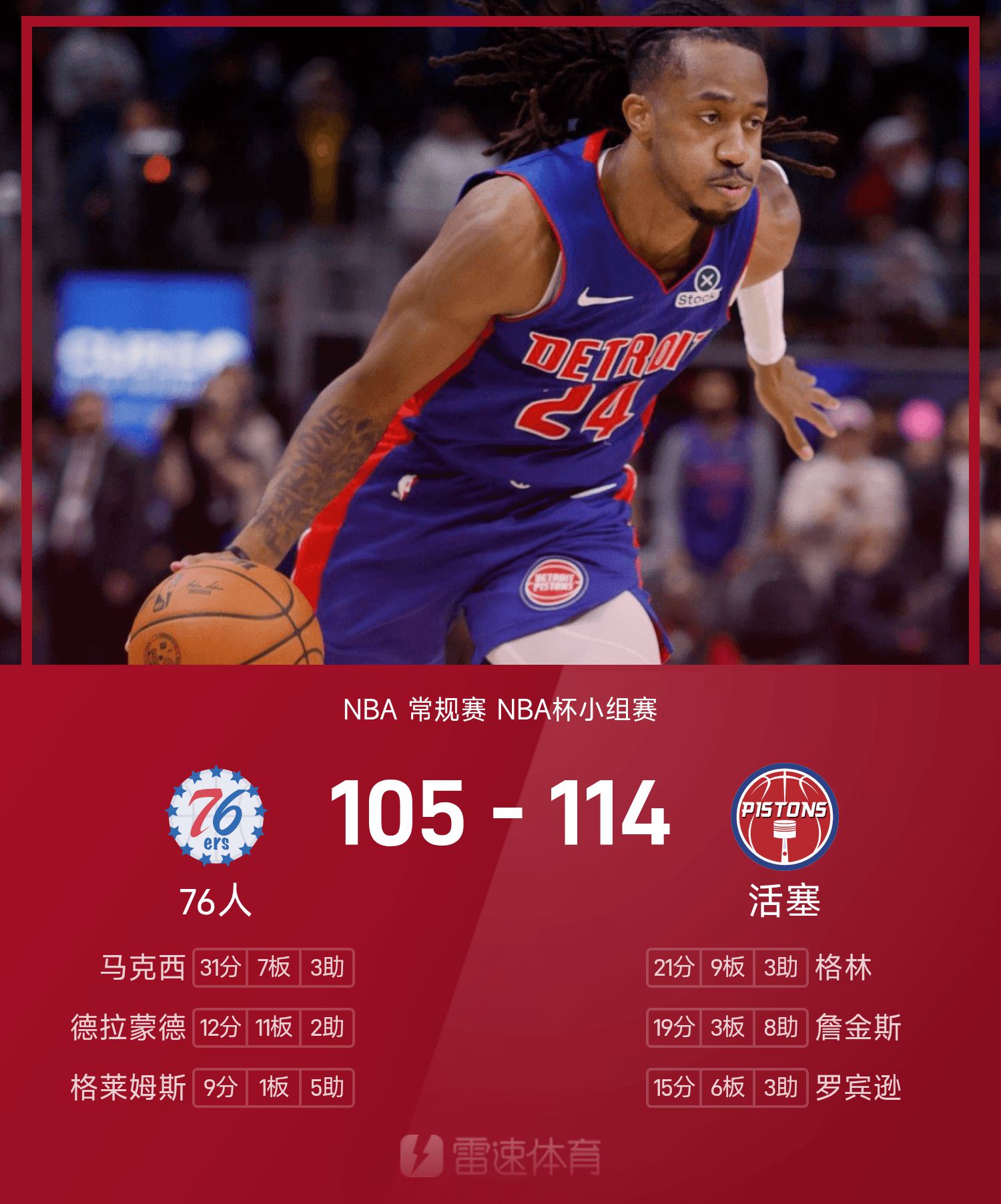 三分球8中5,詹金斯19分3板8助攻率领缺少康宁汉姆的活塞战胜76人,马克西空砍31分7抢篮板3助攻。