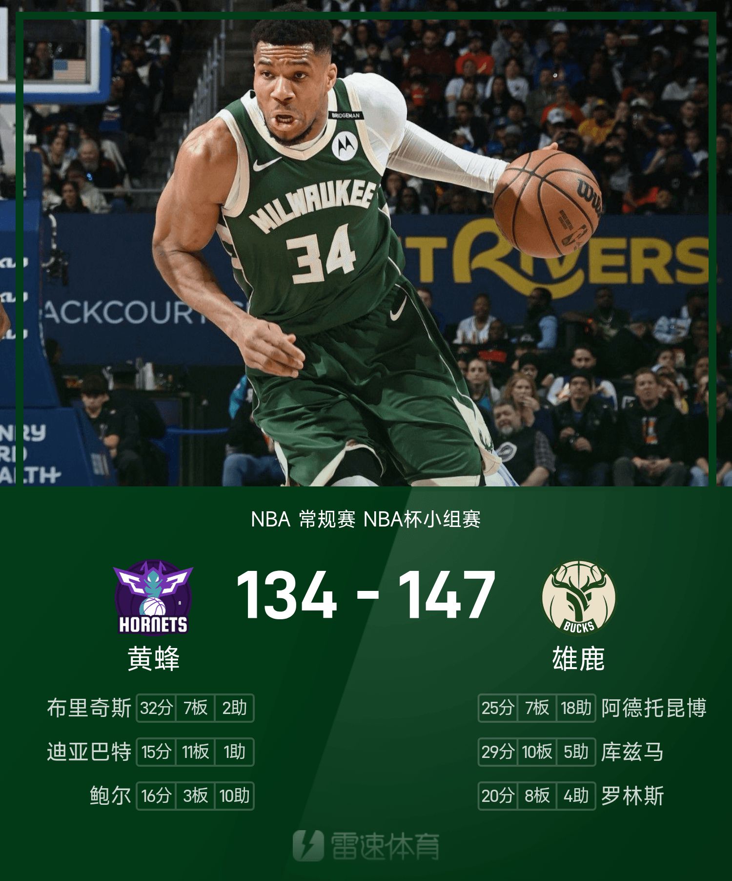 串联球队,字母哥25分7抢篮板18助攻率队延长赛战胜黄蜂,布里奇斯空砍32分7板2助。