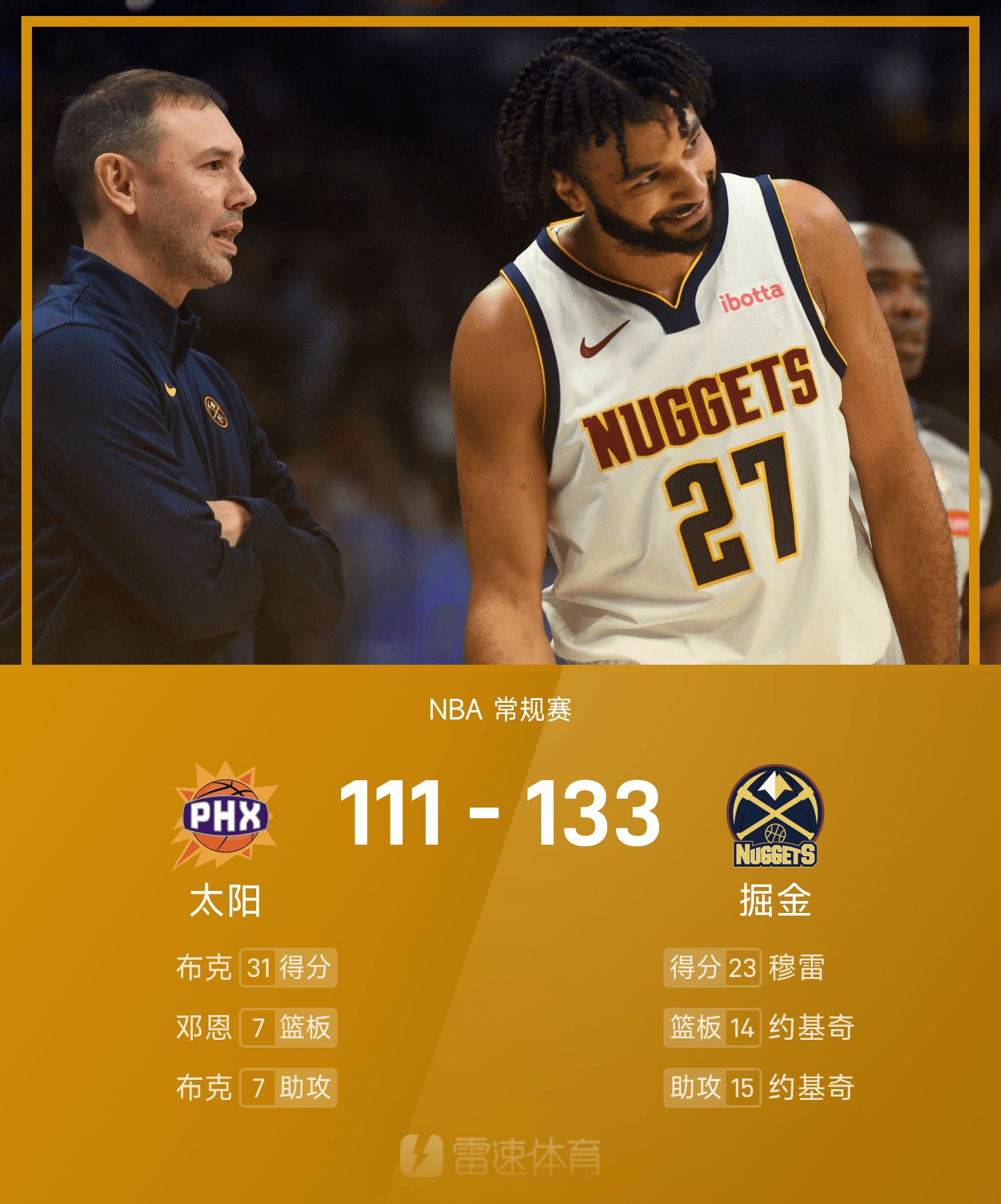 NBA战报:穆雷23分6板,掘金133-111大胜太阳